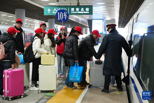 2月24日,来自西安市周至县的务工人员在西安北站登上G1922次列车。(新华社记者 邵瑞 摄)