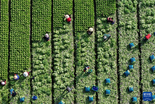 2月24日,农民在四川成都市彭州市九尺镇玉源社区的田地里采收油麦菜(无人机照片)。(新华社发 罗国杨 摄)