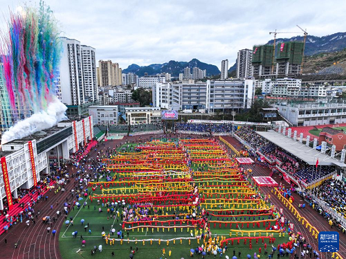 这是2月27日拍摄的贵州省石阡县仡佬毛龙节开幕式现场(无人机照片)。(新华社记者 杨文斌 摄)