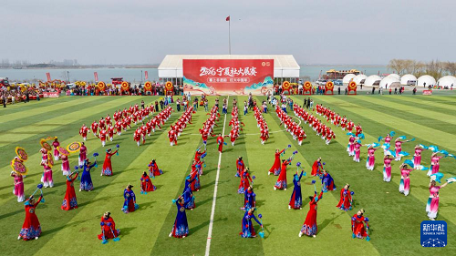 3月1日,在宁夏银川市览山公园,演员在热场节目中表演。(新华社记者 杨植森 摄)