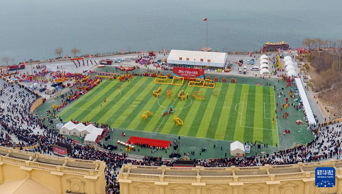 3月1日,在宁夏银川市览山公园,参赛社火队的演员在比赛中(无人机照片)。(新华社记者 马思嘉 摄)