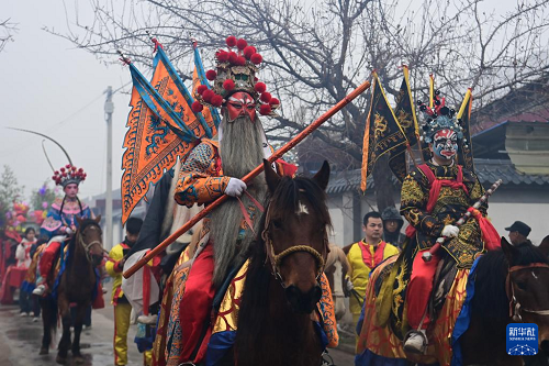 3月2日,陇县黄花峪村社火队在游演途中。(新华社记者 邹竞一 摄)