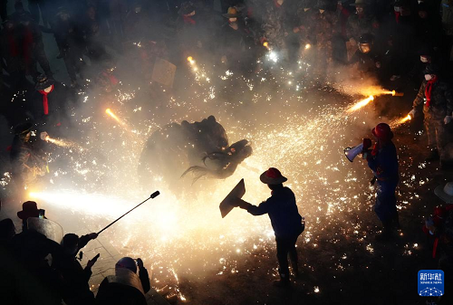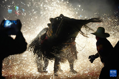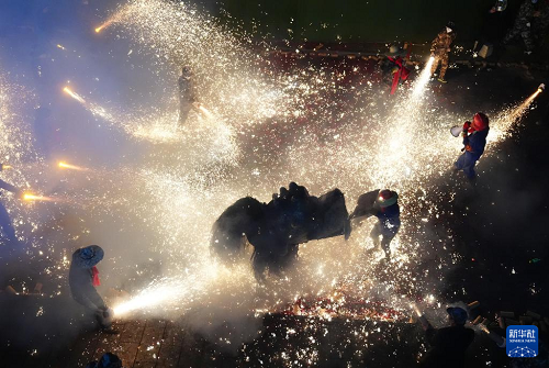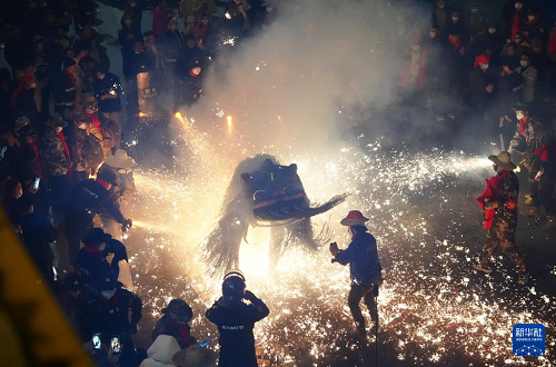 3月2日,在陕西旬阳市蜀河镇蜀河社区,表演人员在用烟花“烧狮子”。(新华社记者 邵瑞 摄)