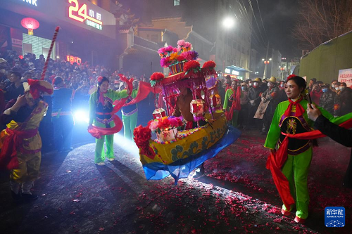 3月2日,在陕西旬阳市蜀河镇蜀河社区,表演人员在“烧狮子”间歇时表演划彩莲船。(新华社记者 邵瑞 摄)