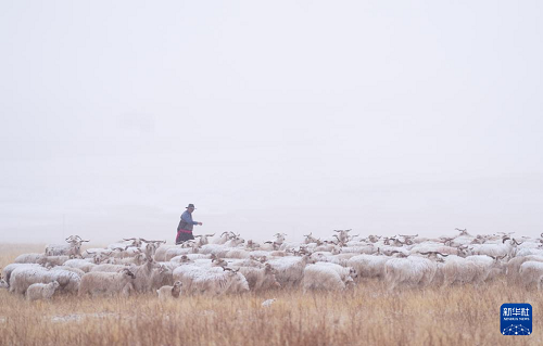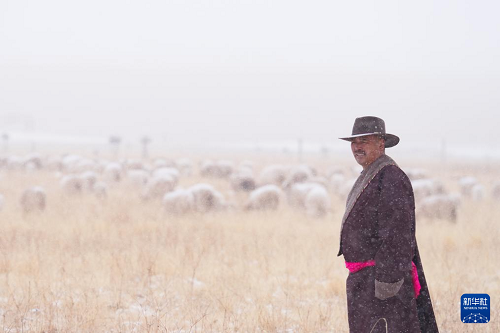 3月8日,在青海省海北藏族自治州祁连县,牧人在雪中放牧。(新华社记者 张龙 摄)