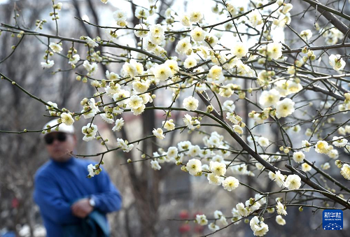 3月16日,一名游客在北京明长城遗址公园欣赏绽放的梅花。(新华社记者 罗晓光 摄)