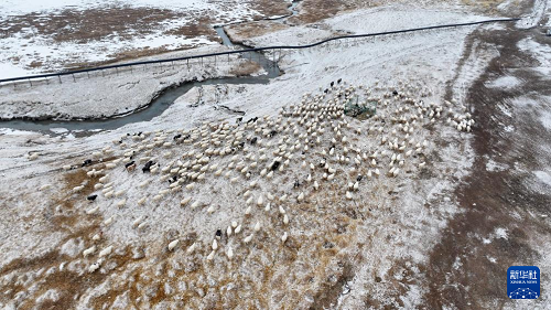 3月18日,在甘肃省阿克塞哈萨克族自治县阿勒腾乡哈尔腾村,羊群在哈尔腾河周边觅食(无人机照片)。(新华社发 高宏善 摄)
