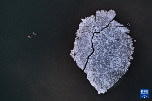 3月22日,候鸟在松花江哈尔滨城区江面休息(无人机照片)。(新华社发 张树 摄)