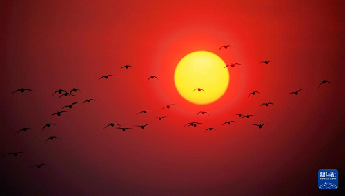 3月22日,一群候鸟在松花江哈尔滨段上空迎着旭日飞翔。(新华社发 张树 摄)