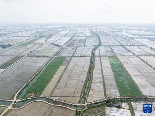 3月24日,在广东江门台山市都斛镇,农业无人机在插好秧苗的田间作业(无人机照片)。(新华社记者 毛思倩 摄)