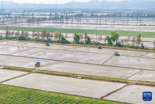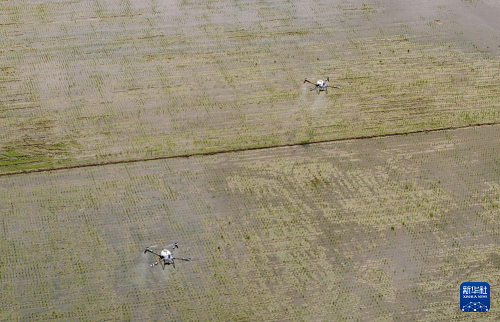 3月24日,在广东江门台山市都斛镇,农业无人机在插好秧苗的田间作业。(新华社记者 毛思倩 摄)