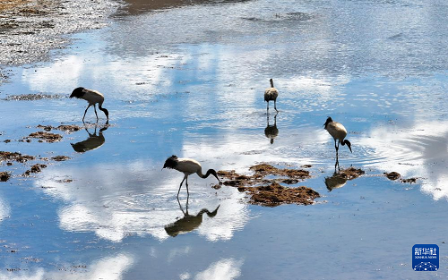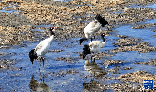 3月29日,黑颈鹤在嘎曲河红原县月亮湾段觅食。(新华社发 谢宏程 摄)