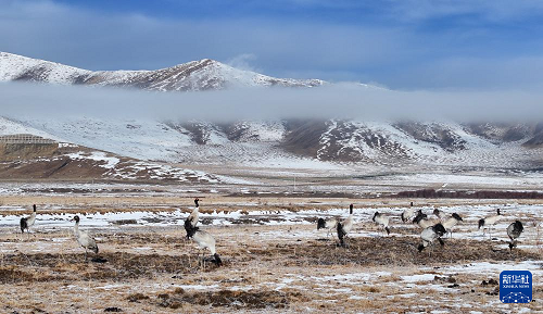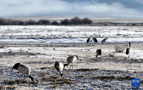 3月29日,黑颈鹤在四川省红原县的草原上觅食。(新华社发 谢宏程 摄)