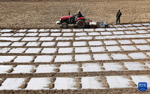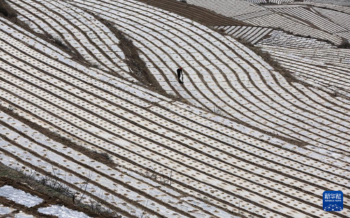 连日来,在黄土高原上的甘肃省天水市武山县,当地农民抓住近期降雨较多、土壤墒情好的有利时机,及时整地、施肥、覆膜保墒,覆膜后的山地梯田成为黄土高原上一道亮丽的春日风景。