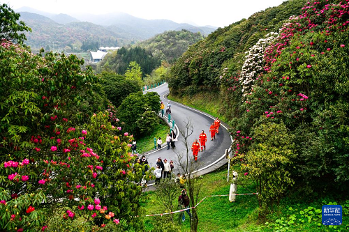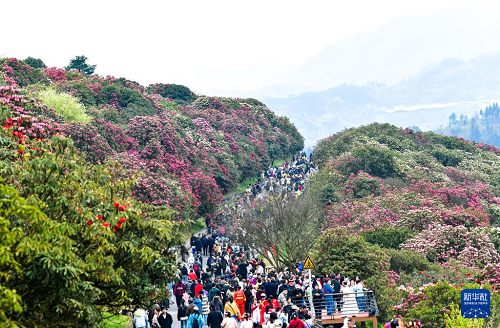 游客在贵州百里杜鹃管理区金坡景区赏花观光(4月1日摄)。(新华社记者 杨文斌 摄)