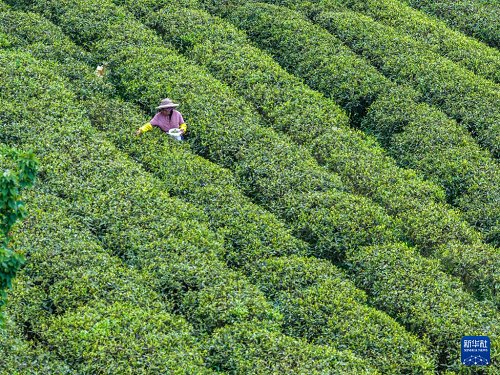 4月9日,茶农在青龙乡茶叶基地内采摘春茶。(新华社记者 唐奕 摄)