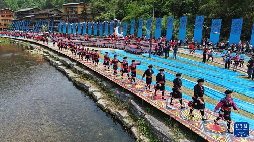 4月19日,在广西桂林市龙胜各族自治县龙脊镇金江村黄洛瑶寨,当地群众参加“T台秀”(无人机照片)。(新华社发 韦吉阳 摄)