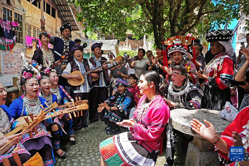 4月19日,在广西桂林市龙胜各族自治县龙脊镇金江村黄洛瑶寨,当地群众和外国友人对山歌。(新华社发 韦吉阳 摄)
