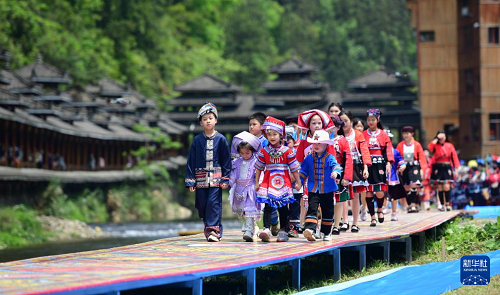 4月19日,在广西桂林市龙胜各族自治县龙脊镇金江村黄洛瑶寨,小朋友身着民族服装参加“T台秀”。(新华社发 潘志祥 摄)