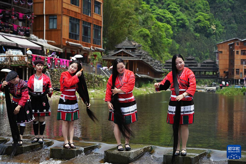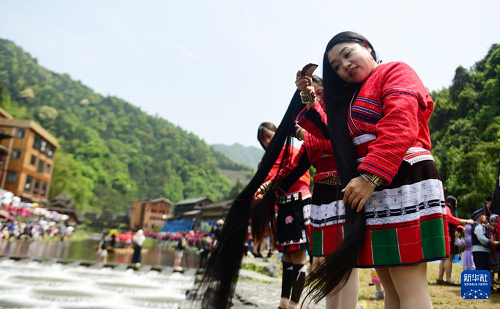 4月19日,在广西桂林市龙胜各族自治县龙脊镇金江村黄洛瑶寨,瑶族妇女在河边展示长发梳妆。(新华社发 韦吉阳 摄)