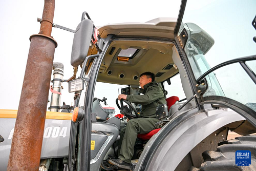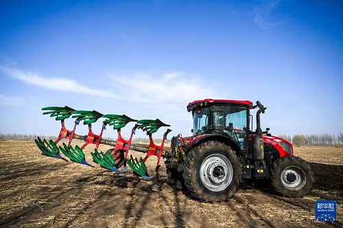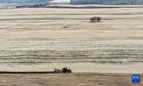 4月17日,在通辽市科尔沁左翼中旗花吐古拉镇,农机手驾驶农机翻地。(新华社记者 连振 摄)
