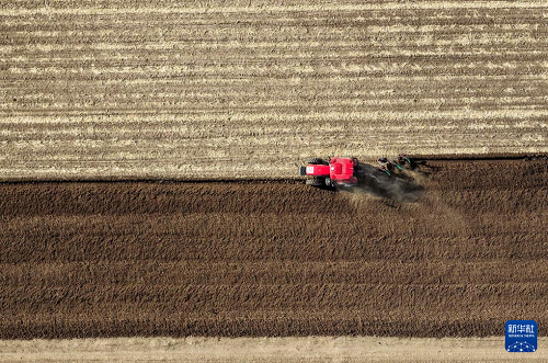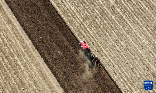 4月19日,在通辽市科尔沁左翼后旗甘旗卡镇,农机手驾驶农机翻地(无人机照片)。(新华社记者 连振 摄)