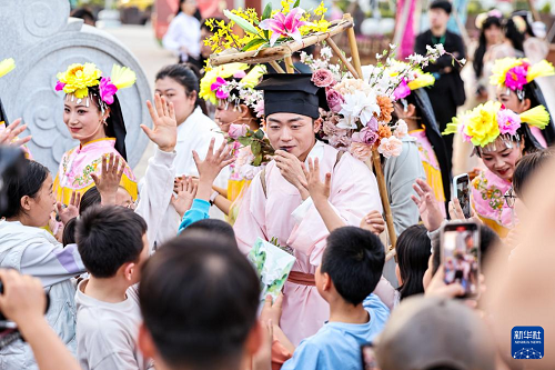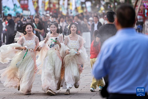 4月25日,在陇南市武都区万象街举行的沉浸式快闪活动中,身着古装的文旅达人在街上游览推介。(新华社发 侯崇慧 摄)