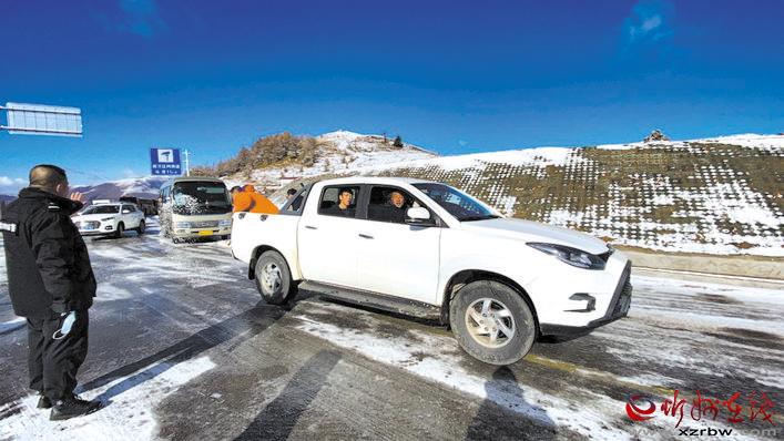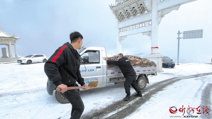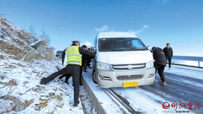 10月16日,五台山景区境内出现雨夹雪天气,伴随着气温下降,部分路段出现积雪。当日7时许,五台山公安分局接到游客报警称,在景区北线鸿门岩路段,由于下雪后道路有大量积雪成冰,导致多辆大巴车和轿车受阻无法通行,请求援助。