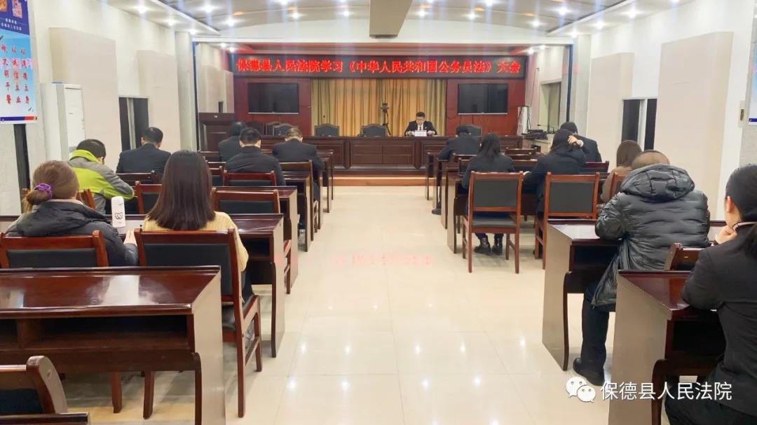 近日,保德法院组织全院干警集中学习了《中华人民共和国公务员法》,院党组成员、政治部主任王波平主持学习。