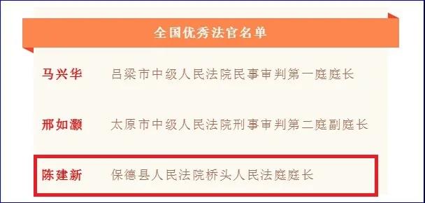 近日,在全国高级法院院长会上,为表彰先进、激励队伍,最高人民法院决定授予83个单位“全国优秀法院”称号,授予97名同志“全国优秀法官”称号,追授2名同志“全国优秀法官”称号,授予198名同志“全国法院办案标兵”称号。其中忻州法院系统一名员额法官荣获“全国优秀法官”称号。
