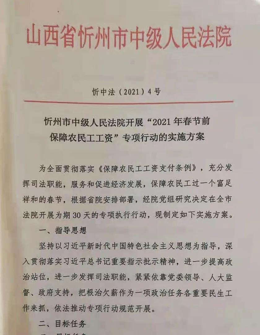 为全面贯彻落实《保障农民工工资支付条例》,充分发挥司法职能,保障农民工过一个富足祥和的春节,忻州中院党组于近期在全市法院范围开展了为期30天的“2021年春节前保障农民工工资”专项执行行动。