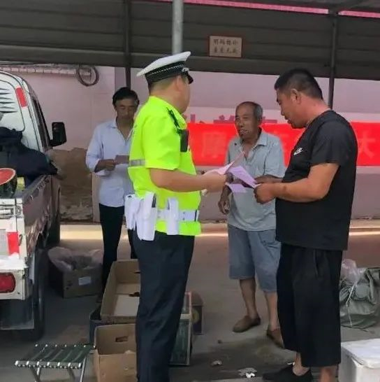 7月13日上午,忻州市公安局交警支队直属四大队民警走进庄磨镇集贸市场开展三轮车违法载人交通安全宣传活动。
