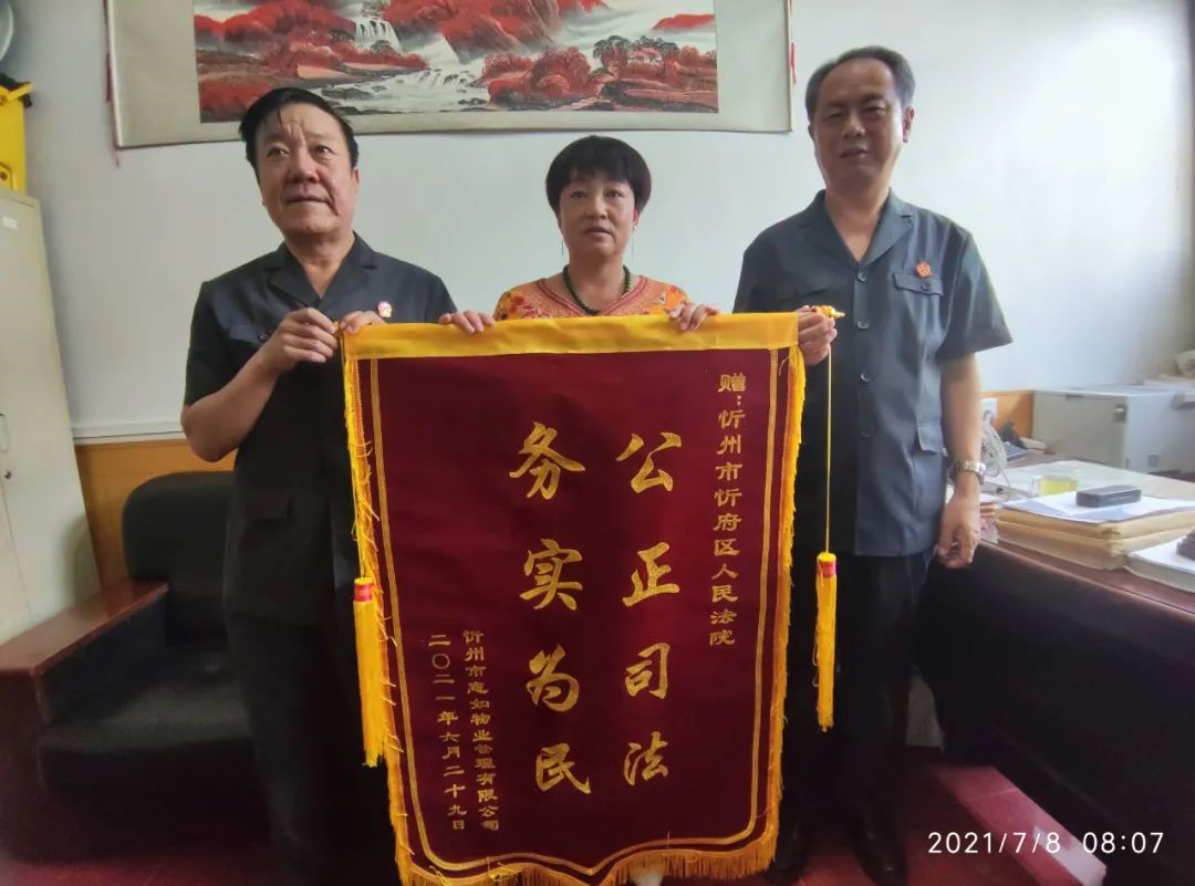 功夫不负有心人,在李鑫法官和同事的努力下,业主情绪逐渐缓和,24件系列案全部调解撤诉。原告忻州市志如物业管理服务有限公司及时收到了业主的物业费,24名业主没有因作为被告而奔波于诉累。撤诉裁定送达后,忻州市志如物业管理服务有限公司的亢某再次来到忻府区法院,将一面写有“公平正义 务实为民”的锦旗送到法官手中,以示感谢。