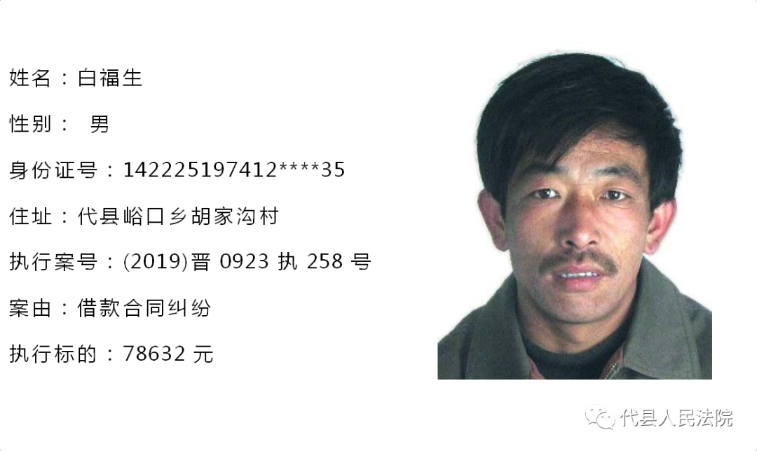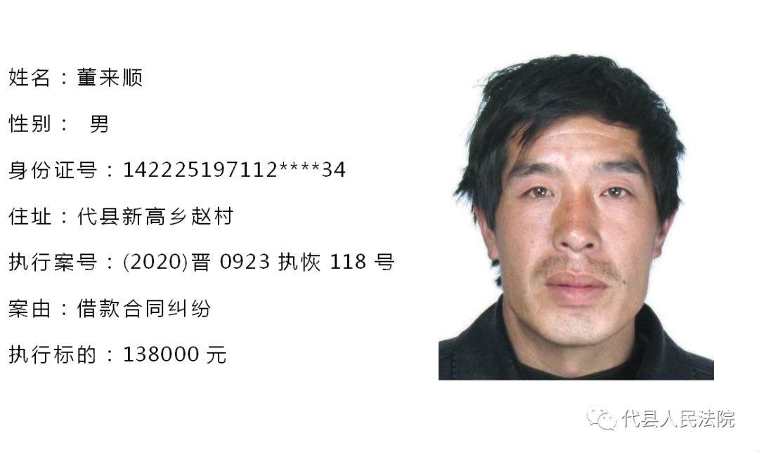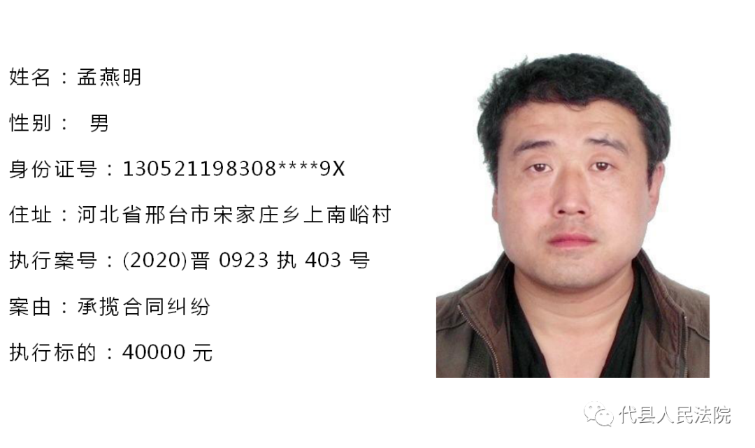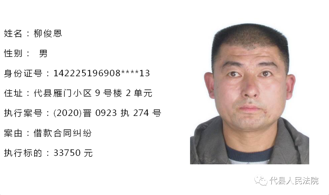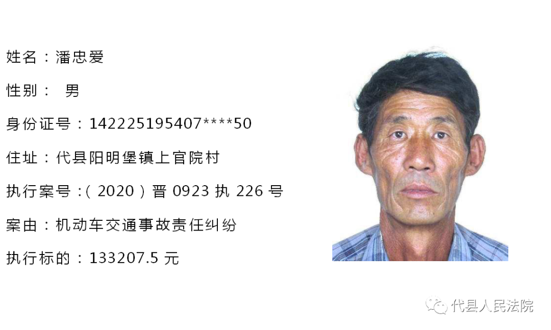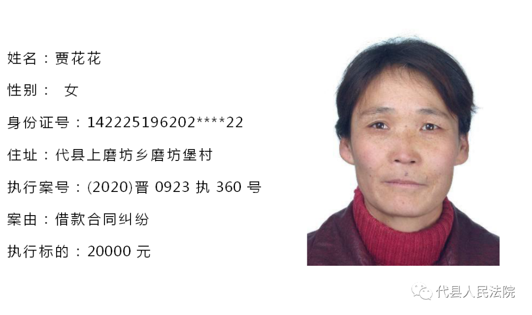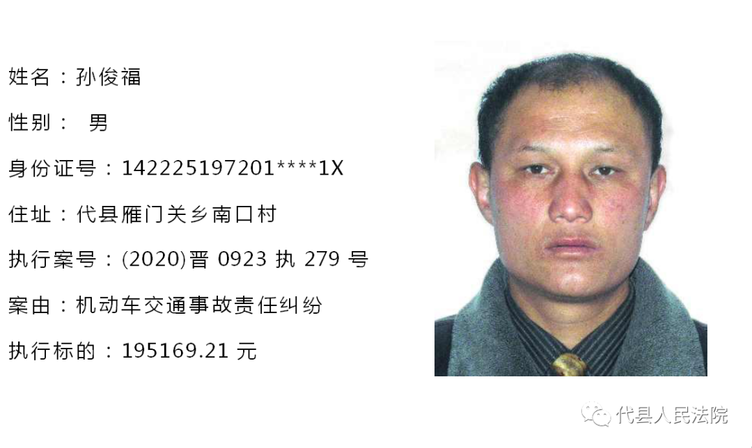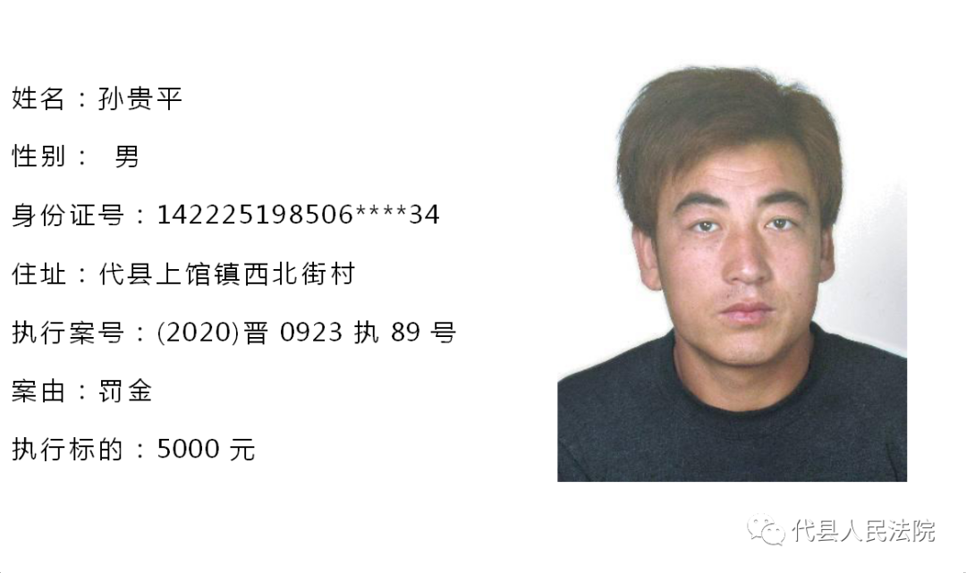 为促使被执行人自觉履行生效法律文书确定的义务,推进社会信用体系建设,根据《中华人民共和国民事诉讼法》第二百五十五条、《最高人民法院关于公布失信被执行人名单信息的若干规定》第七条之规定,现将代县法院拒不履行生效法律文书的被执行人公布如下,责令其立即向执行法院履行义务。对涉嫌拒不执行法院判决、裁定犯罪的被执行人,将依照《中华人民共和国刑法》第三百一十三条之规定,严肃追究其刑事责任。