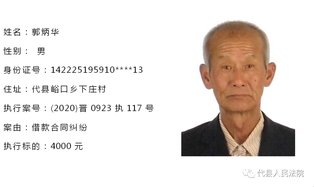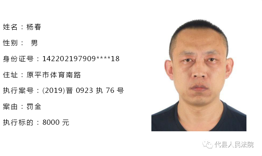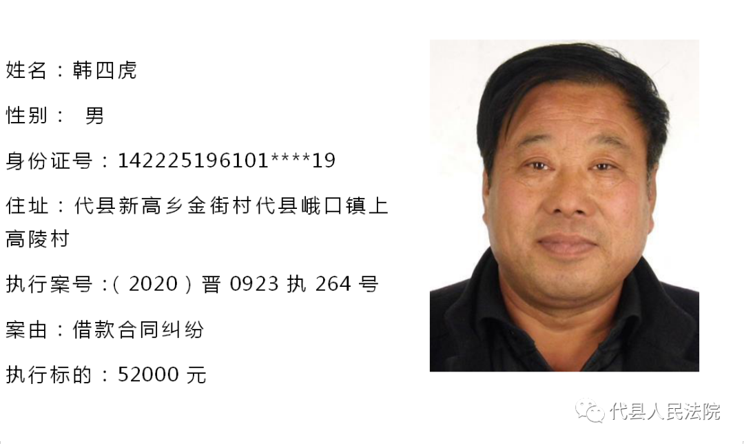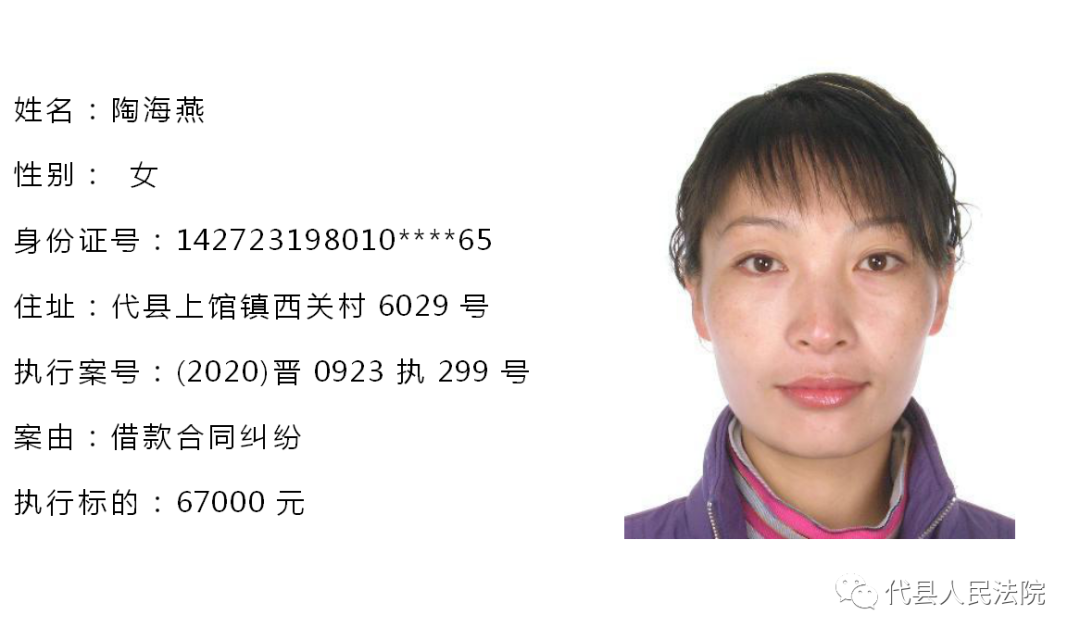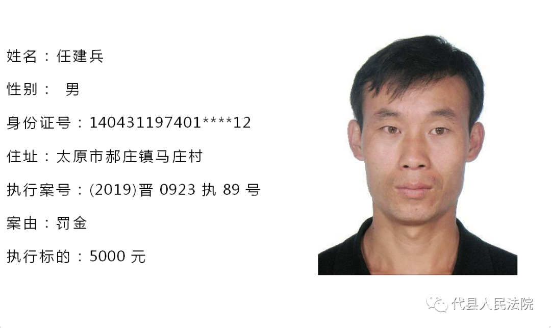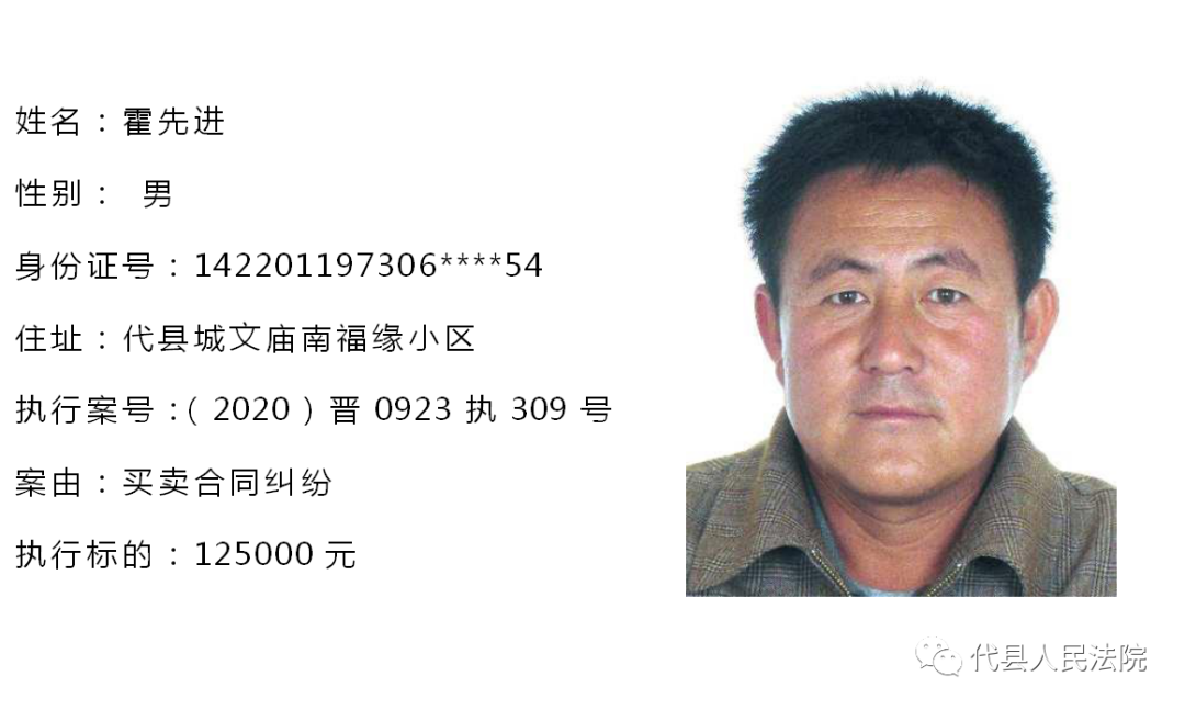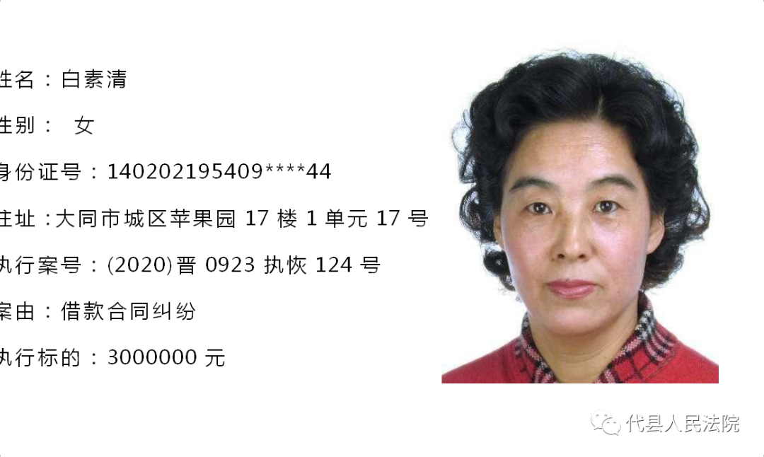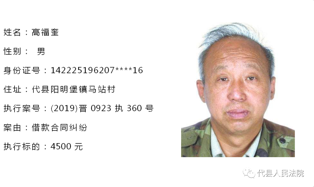 为促使被执行人自觉履行生效法律文书确定的义务,推进社会信用体系建设,根据《中华人民共和国民事诉讼法》第二百五十五条、《最高人民法院关于公布失信被执行人名单信息的若干规定》第七条之规定,现将代县法院拒不履行生效法律文书的被执行人公布如下,责令其立即向执行法院履行义务。对涉嫌拒不执行法院判决、裁定犯罪的被执行人,将依照《中华人民共和国刑法》第三百一十三条之规定,严肃追究其刑事责任。