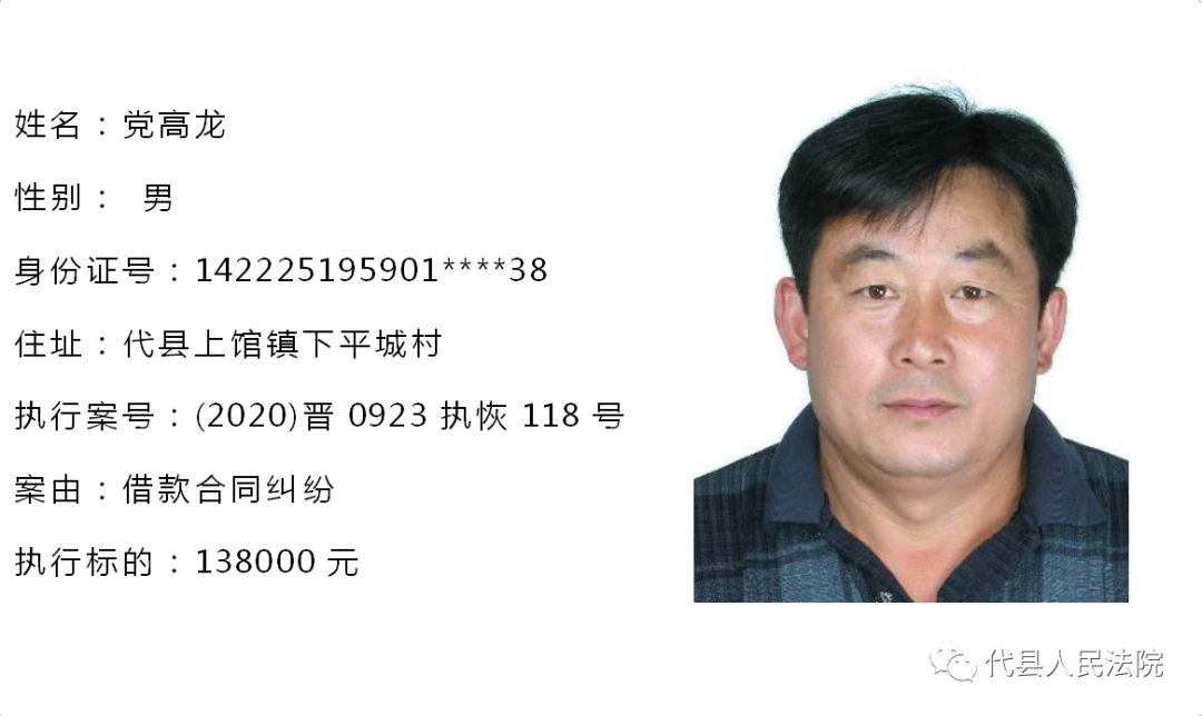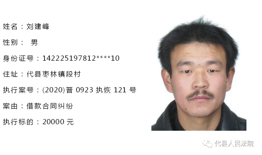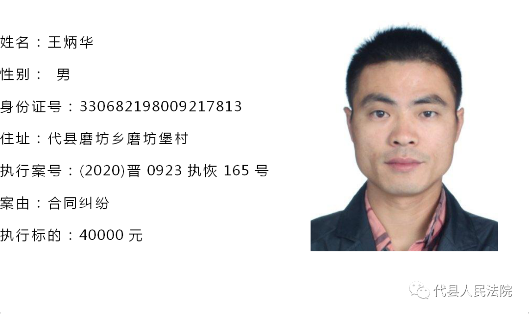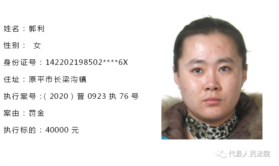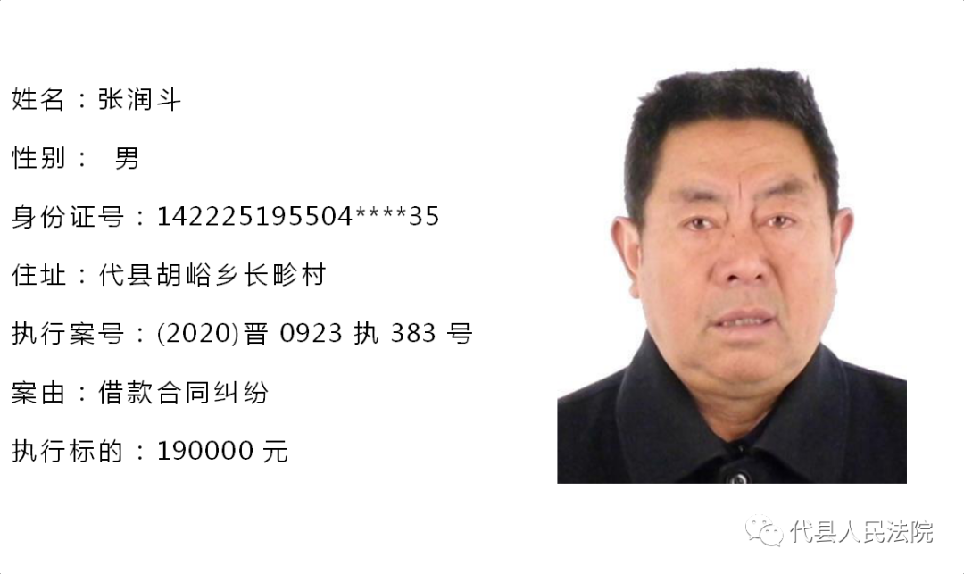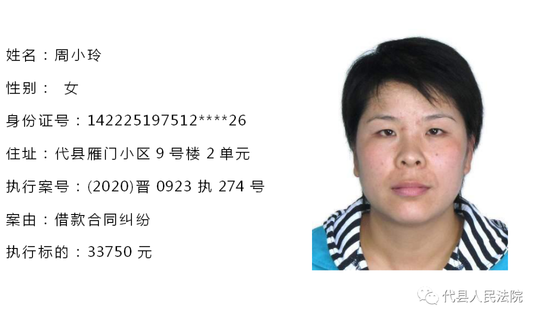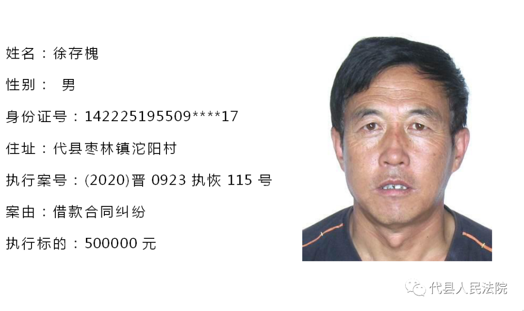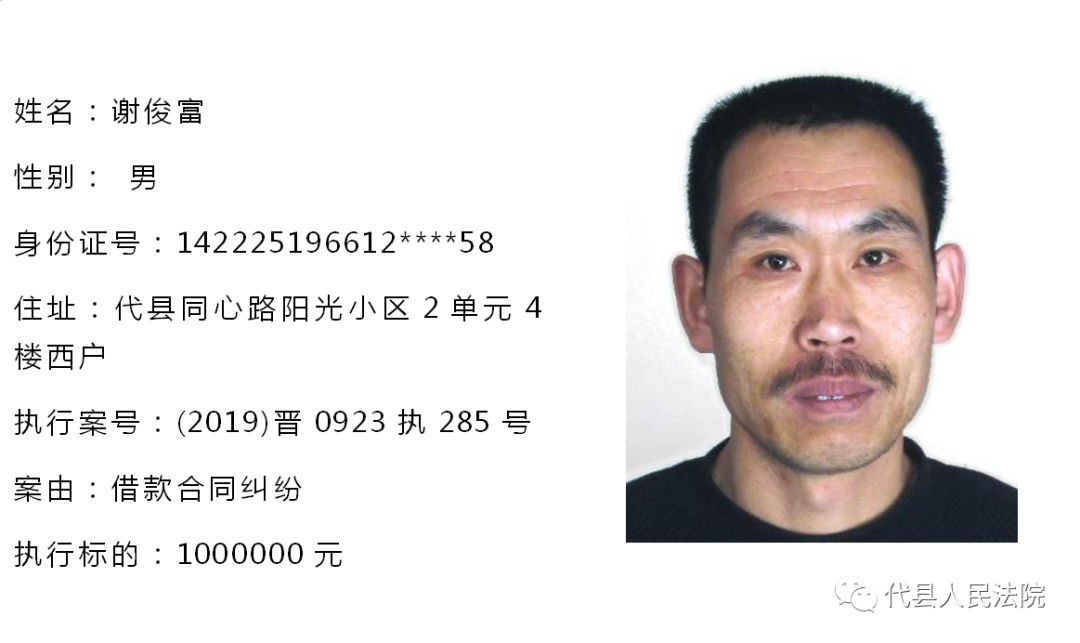为促使被执行人自觉履行生效法律文书确定的义务,推进社会信用体系建设,根据《中华人民共和国民事诉讼法》第二百五十五条、《最高人民法院关于公布失信被执行人名单信息的若干规定》第七条之规定,现将代县法院拒不履行生效法律文书的被执行人公布如下,责令其立即向执行法院履行义务。对涉嫌拒不执行法院判决、裁定犯罪的被执行人,将依照《中华人民共和国刑法》第三百一十三条之规定,严肃追究其刑事责任。