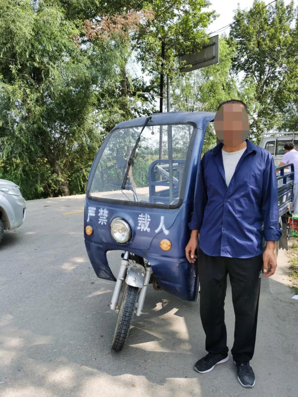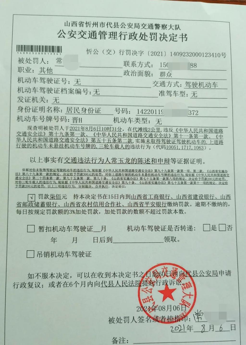 2021年8月6日10时31分许,忻州市代县县乡公路代滩线2KM处。一辆未悬挂车牌、违法载人的农用三轮车驶入代县交警设立的临时检查通道。