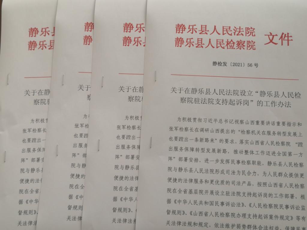 为依法维护弱势群体的合法权益,向人民群众提供更便捷的法律服务,进一步深化“我为群众办实事”实践活动,根据《山西省人民检察院办理支持起诉案件规定(试行)》,近日,静乐县人民检察院与静乐县人民法院联合出台了《关于在静乐县人民法院设立静乐县人民检察院驻法院“支持起诉岗”的工作办法(试行)》,并在县法院设立了检察机关“支持起诉岗”,加强与人民法院的沟通和协调,推动建立维护弱势群体合法权益的长效机制。