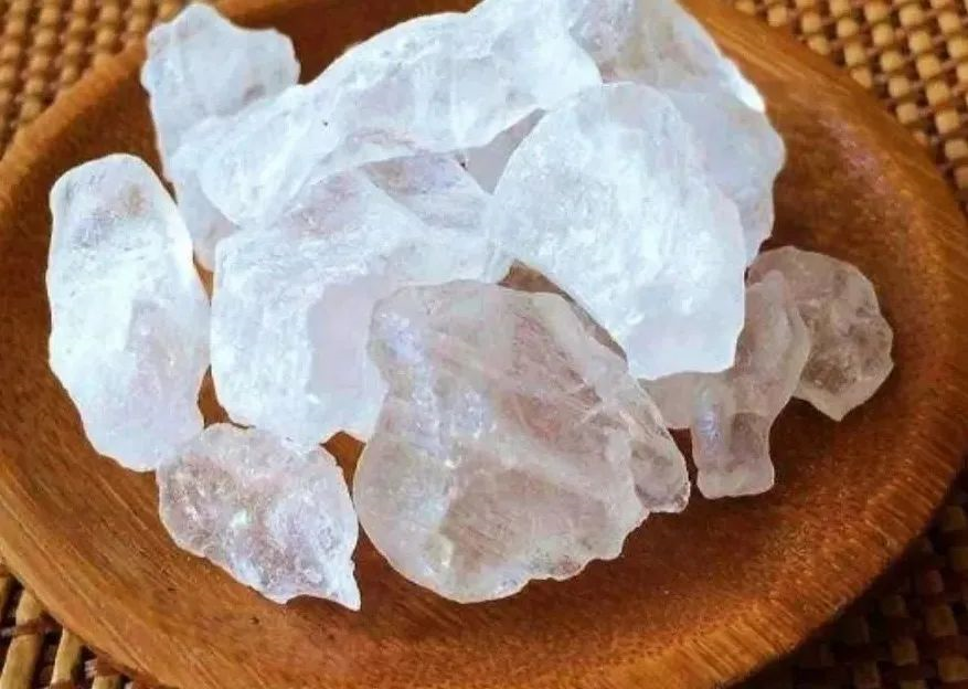 “明矾”化学名“十二水硫酸铝钾”,是一种硫酸钾及硫酸铝的复盐,呈无色透明块状的结晶体或结晶性粉末物质,特点无臭味,口感微甜又酸涩。