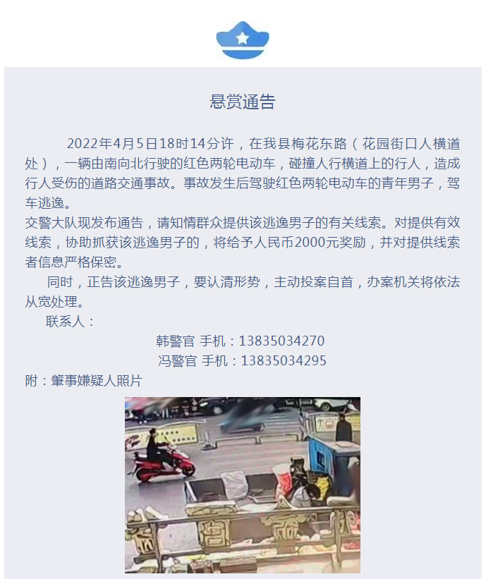 到达现场后,民警立即查看伤者情况,在确认伤者情况稳定后,开始对事故发生经过进行了解。同时调取周边视频监控,最终确认肇事逃逸的嫌疑人是一名驾驶红色两轮电动车的青年男子。但是由于监控盲区等原因,民警无法确认该电动车车牌号,侦破难度大。为还伤者公道,保德交警调取了该电动车途经路段的所有监控视频,根据其行驶路线一步一步逐步调查,同时发布悬赏通告,发动群众一起寻找肇事驾驶员。