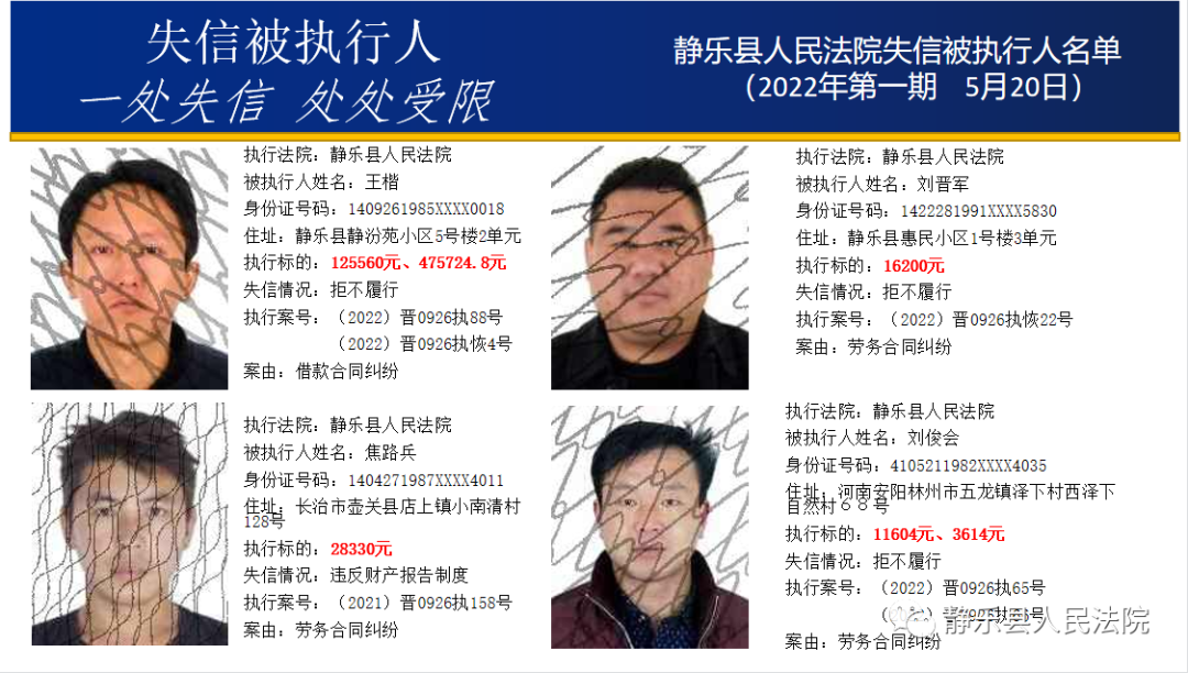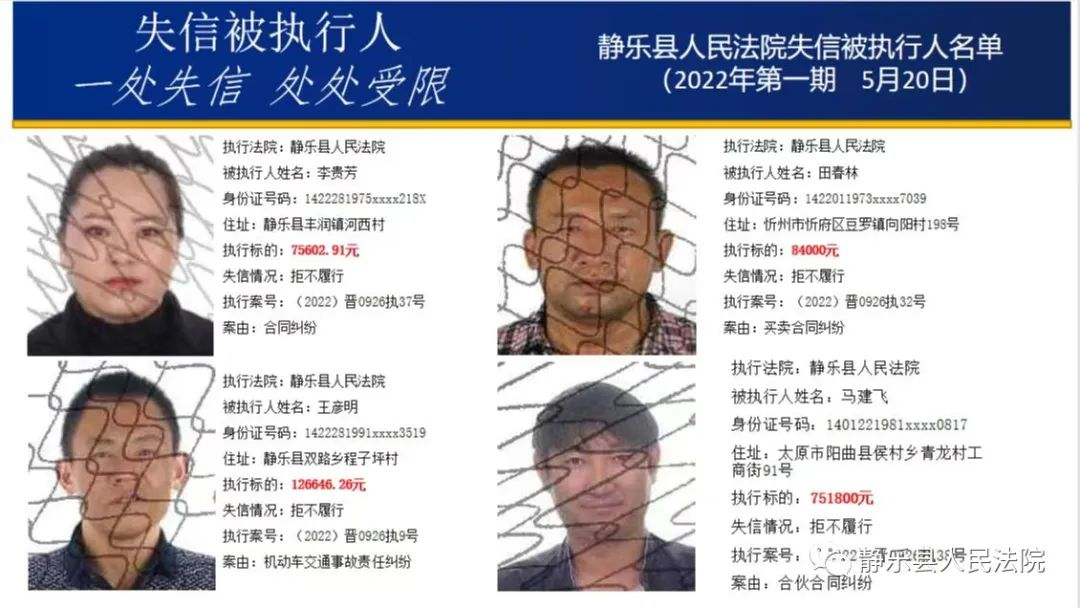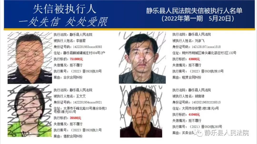 为回应新时期人民群众对人民法院执行工作的新期盼、新要求,促使被执行人自觉履行生效法律文书确定的义务,推进社会信用体系建设,根据《中华人民共和国民事诉讼法》第二百六十二条、《最高人民法院关于公布失信被执行人名单信息的若干规定》第七条之规定,静乐县人民法院现将12名失信被执行人向社会公开曝光。