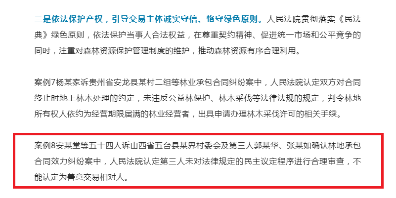 会上发布的典型案例体现了人民法院发挥环境资源审判职能作用,对森林资源保护和利用法律适用规则的有益探索及经验总结,涉及长江防护林保护、黑土区周边荒山治理、森林火灾防治、绿色金融等多方面内容。其中,由忻州市五台县人民法院审理的安某堂等五十四人诉山西省五台县某界村委会及第三人郭某华、张某如确认林地承包合同效力纠纷案入选十大典型案例。