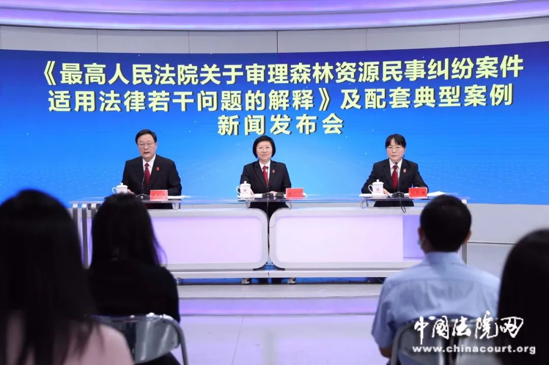 6月14日上午,最高人民法院召开新闻发布会,发布《最高人民法院关于审理森林资源民事纠纷案件适用法律若干问题的解释》及配套典型案例并回答记者提问。最高人民法院副院长杨临萍、最高人民法院环资庭庭长刘竹梅出席发布会。