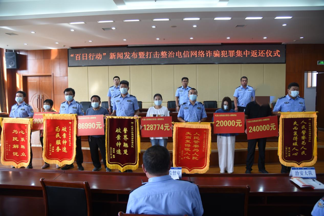 8月19日下午,代县公安局举行“百日行动”新闻发布暨打击整治电信网络诈骗犯罪集中返还仪式。活动现场返还了5名受损群众被骗资金共计49万余元。