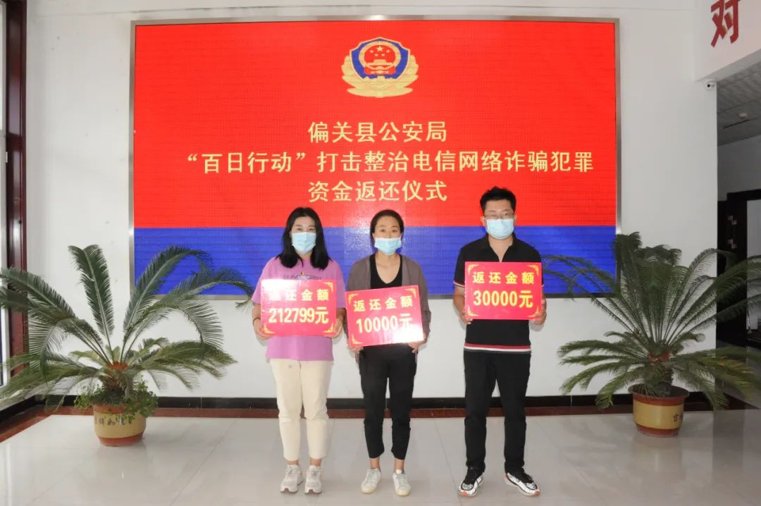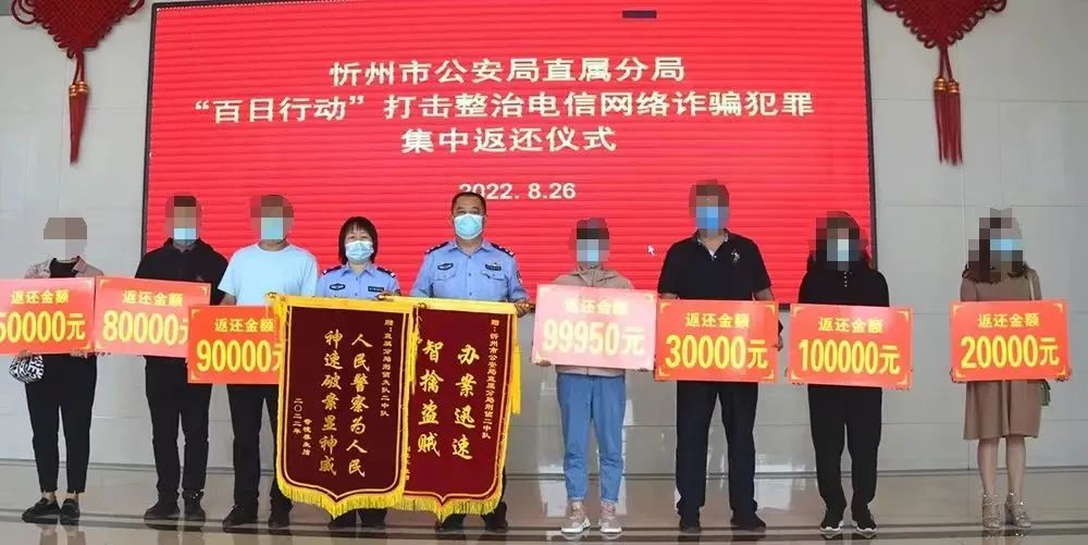 为积极回应群众期望,展示“百日行动”以来取得的重大战果,按照忻州市公安局统一部署,各分县局分别举行了“百日行动”打击整治电信网络诈骗犯罪集中返还仪式,集中向受害群众返还一批追缴、冻结资金。