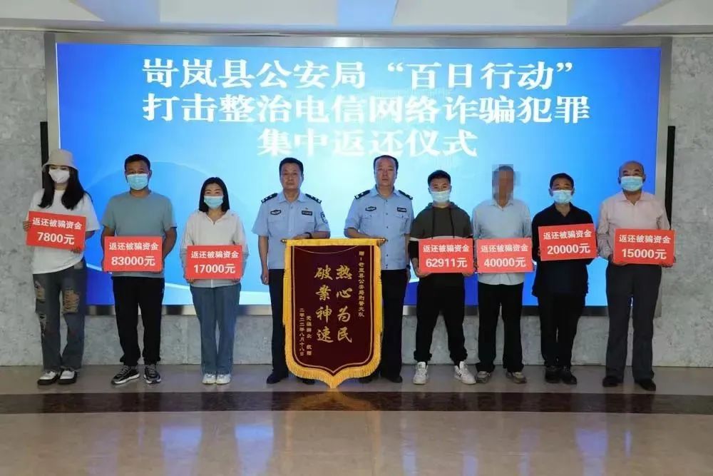 8月20日,静乐县公安局组织开展“深化‘百日行动’暨电诈案件涉案资金返还仪式”,将近期依法追缴的涉案资金25万余元集中返还给了8名受害群众。