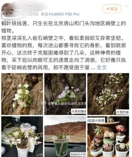 法治进行时报道,孙某去北京门头沟游玩,在一处山崖采摘了一株花带回家,并且发了微博炫耀。不到一天,花儿便被养死了。森林公安找上门,因孙某涉嫌危害国家重点保护植物,依法将其刑事拘留。