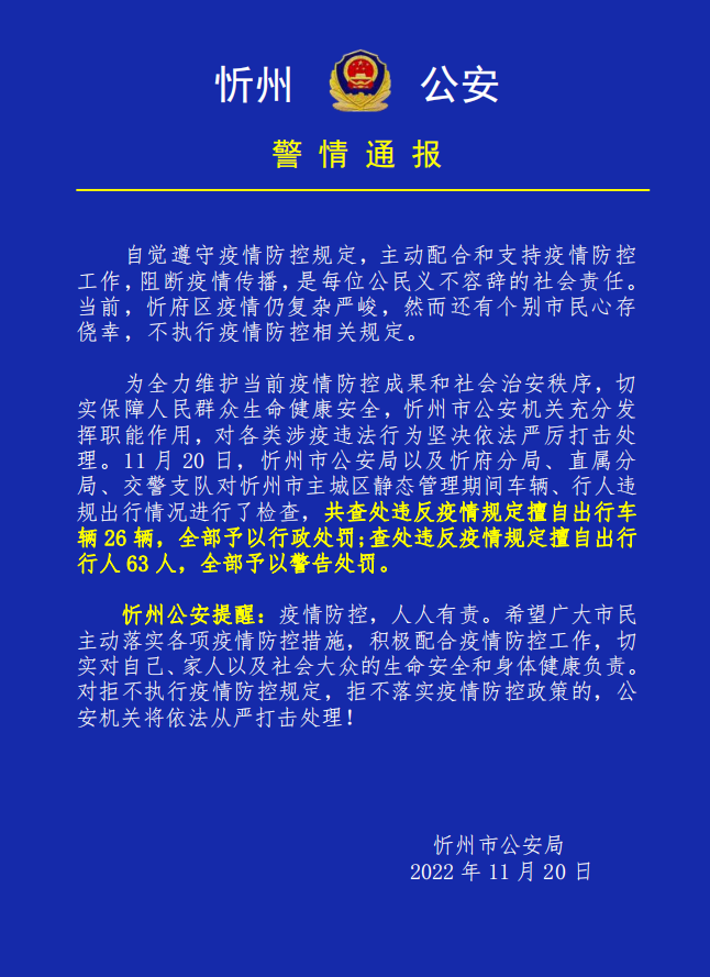 11月20日公安机关查处忻府区违反疫情防控规定行为89例
