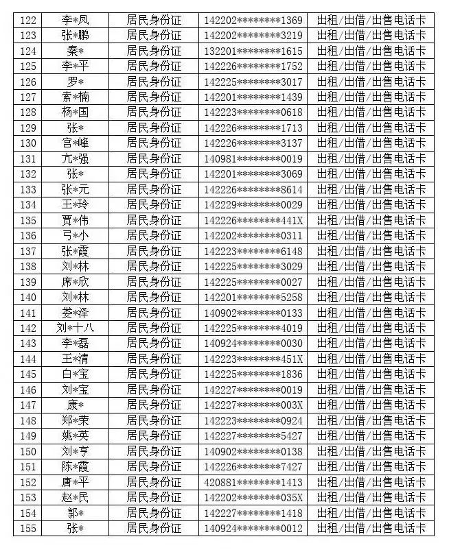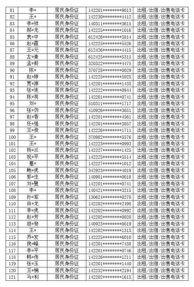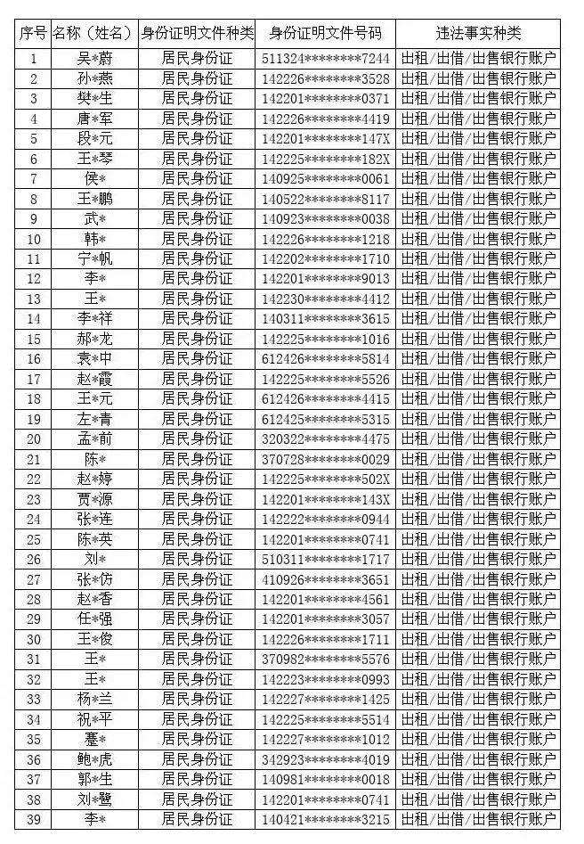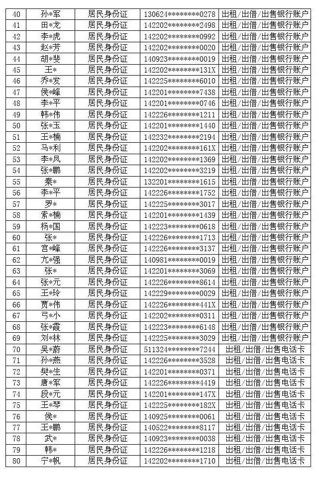 按照公安部“断卡”专项行动工作部署,忻州市公安局全力以赴推进专项行动,严厉打击整治非法租借、买卖银行卡和手机卡等违规违法犯罪行为,从源头斩断“两卡”的利益链条,全力压缩电信诈骗黑灰产业生存空间,确实保障人民群众切身利益,现曝光本市2023年第三批因非法贩卖、出售、出借“两卡”涉嫌电信网络诈骗被惩戒的人员。