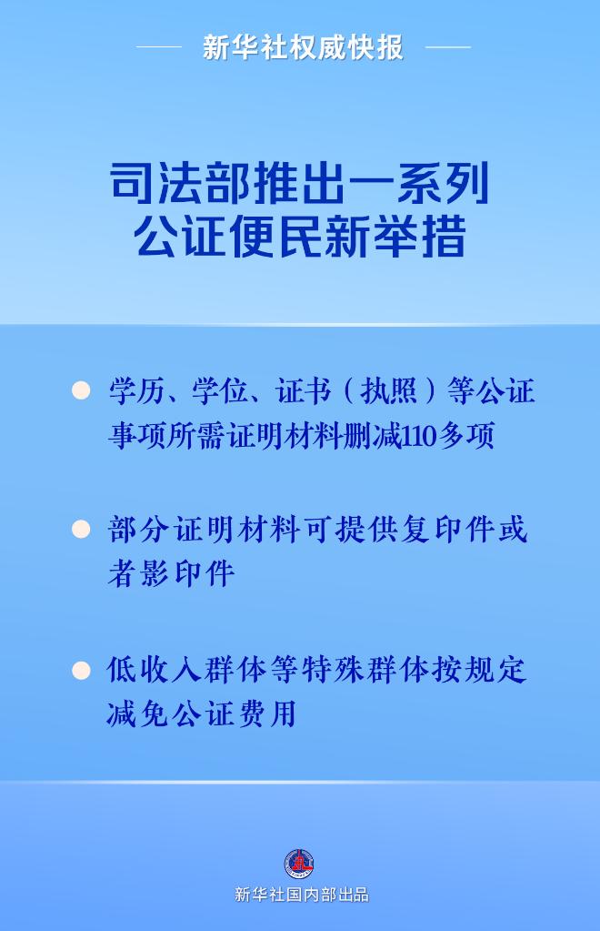 司法部3日召开新闻发布会,介绍近期公证服务减证便民情况。据悉,保全、学历、学位、证书(执照)、现场监督、合同(协议)等公证事项所需证明材料从396项删减到280项;事实清楚、法律关系简单的一些公证事项中涉及的辅助性证明材料,不再要求当事人提供原件,提供复印件或者影印件即可;80岁及以上老人首次办理遗嘱公证免收遗嘱公证服务费用,低收入群体、残疾人、农民工、老年人、青少年、单亲困难母亲等特殊群体和军人军属、退役军人及其他优抚对象按规定减免公证费用。